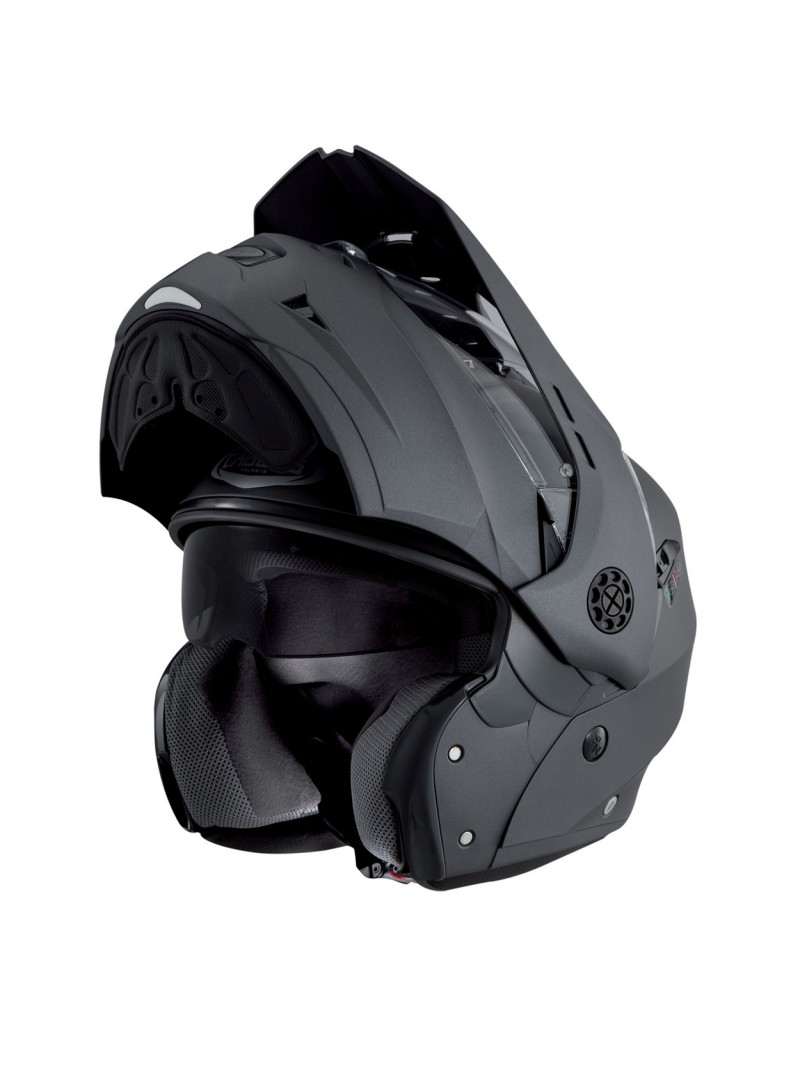 TOURMAX è dotato dell’esclusivo sistema Double Visor Tech che grazie ad una visiera parasole integrata facile da manovrare, permette di guidare sempre con la giusta luce e quindi con la massima sicurezza. La visiera parasole è resistente al graffio, mentre quella esterna trasparente non solo al graffio ma anche all’appannamento grazie alla doppia lente Pinlock. La ventilazione è garantita da due ampi aeratori facili da manovrare anche con i guanti posizionati sulla mentoniera e sulla parte superiore della calotta che attraverso una serie di canali interni assicurano un ottimo ricambio d’aria interno.