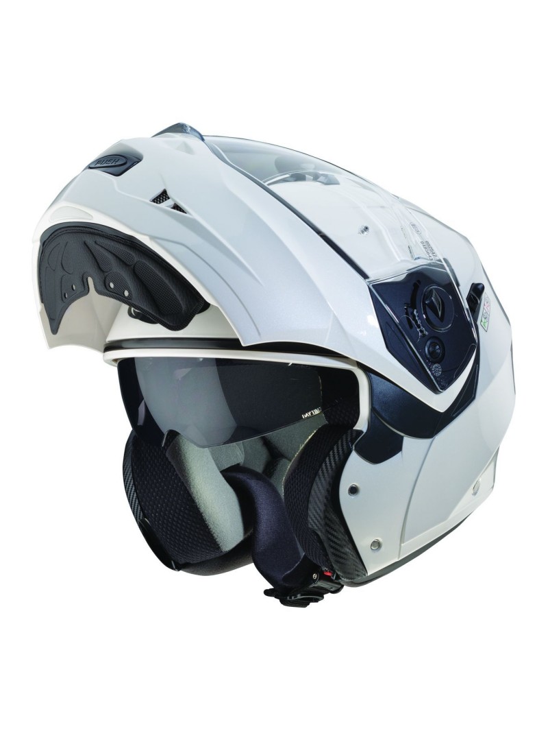 DUKE II è dotato dell’esclusivo sistema Double Visor Tech che, grazie ad una visiera parasole integrata facile da manovrare, permette di guidare sempre con la giusta luce e quindi con la massima sicurezza. La visiera parasole è resistente al graffio, mentre quella esterna trasparente non solo al graffio, ma anche all’appannamento grazie alla doppia lente Pinlock. La ventilazione è garantita da due ampi aeratori facili da manovrare posizionati sulla mentoniera e sulla parte superiore della calotta che assicurano un ottimo ricambio d’aria interno attraverso una serie di canali interni. L’interno è completamente amovibile e lavabile con inserti posteriori rifrangenti, realizzato con tessuti traspiranti ed ipoallergenici per garantire la massima freschezza ed igiene. All’interno del Duke II può essere alloggiato il sistema di comunicazione JUST SPEAK EVO, che permette di comunicare non solo con il proprio telefono cellulare e con il proprio passeggero, ma anche di collegarsi ad un GPS ed ascoltare musica attraverso il telefono o un lettore Mp3. JUST SPEAK EVO è inoltre dotato di profilo Bluetooth A2DP che permette l’ascolto in alta qualità stereo. DUKE II è offerto in quattro versioni monocolore: blu opaco YAMA, bianco metallizzato, nero opaco e antracite opaco, oltre alla versione SMART nera non verniciata. Disponibili anche le due versioni grafiche SUPERLEGEND, rosso/bianco e nero opaco/giallo fluo oltre alla versione grafica KITO nero opaco/antracite ed alle due nuove versioni grafiche TOUR nero opaco/antracite/giallo fluo e nero opaco/antracite/fucsia pensato per le centaure.